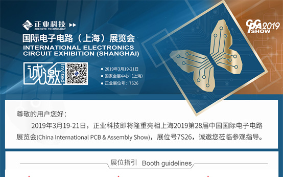 2019年3月19-21日,正業(yè)科技即將隆重亮相上海2019第28屆中國國際電子電路展覽會(huì )(China International PCB & Assembly Show),展位號7S26,誠邀您蒞臨參觀(guān)指導。